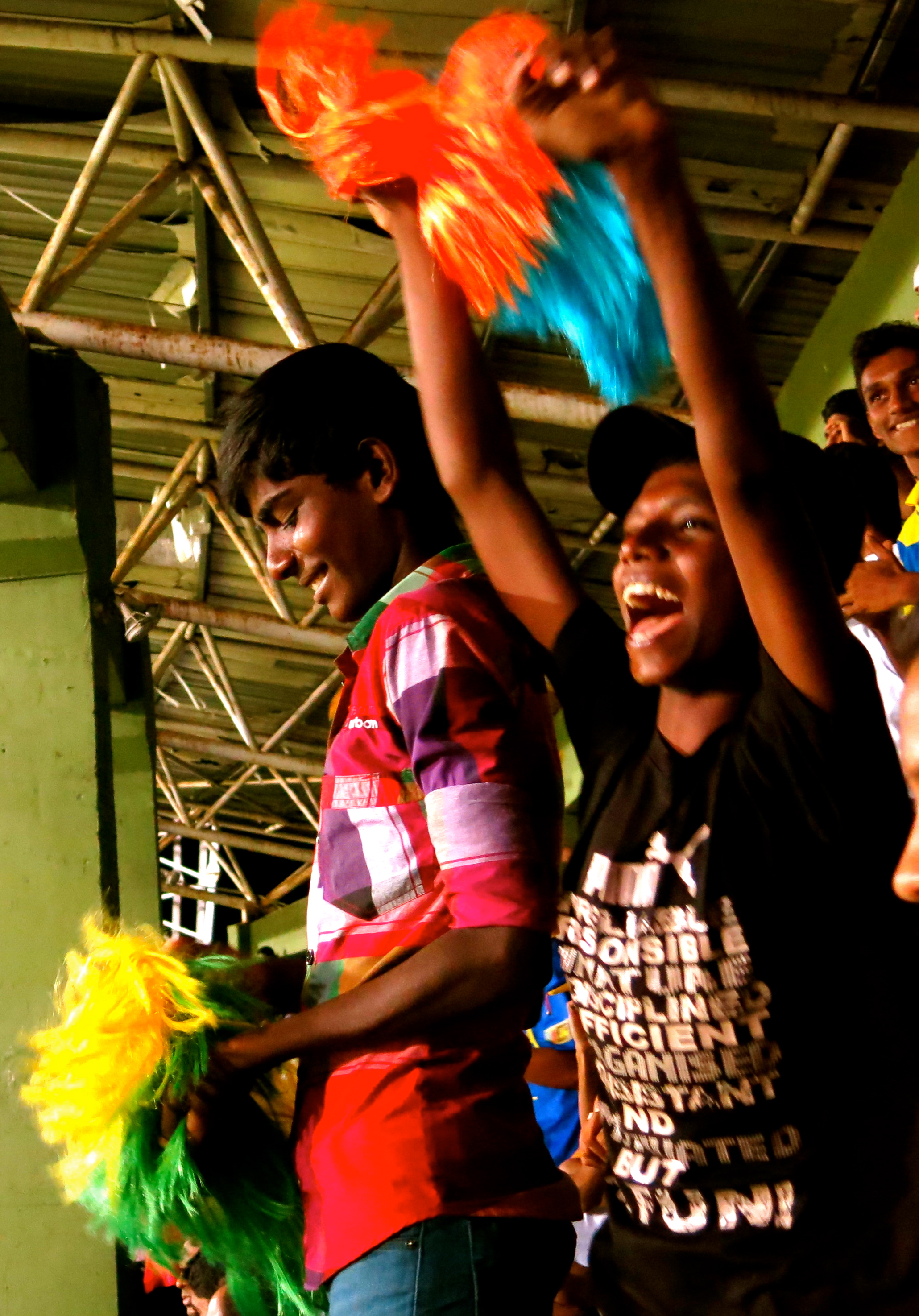 From the moment the Sri Lankan team entered the field the noise started and did not stop for the whole game. People were over come by cricket fever and started to jump, dance, convulse, clap, shake, yell, scream, blow horns, bang drums, and generally lose their mind. The only time there was a variation to the noise level was for a wicket or boundary. When Sangakkara hit a six the stadium went into extra stupid mode and all hell broke loose as if everyone simultaneously did a giant Harlem shake.
