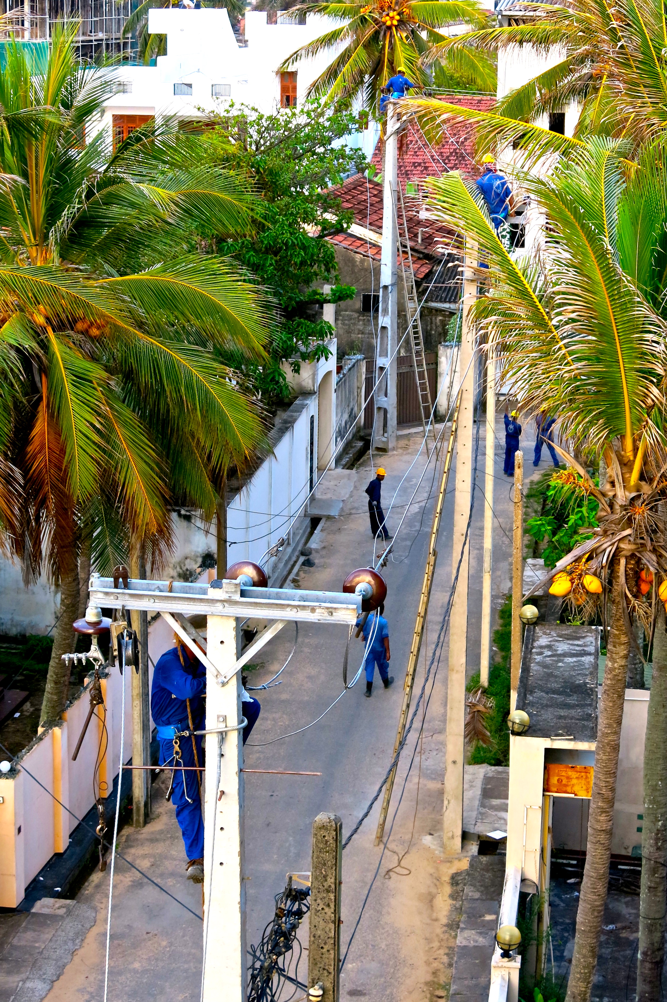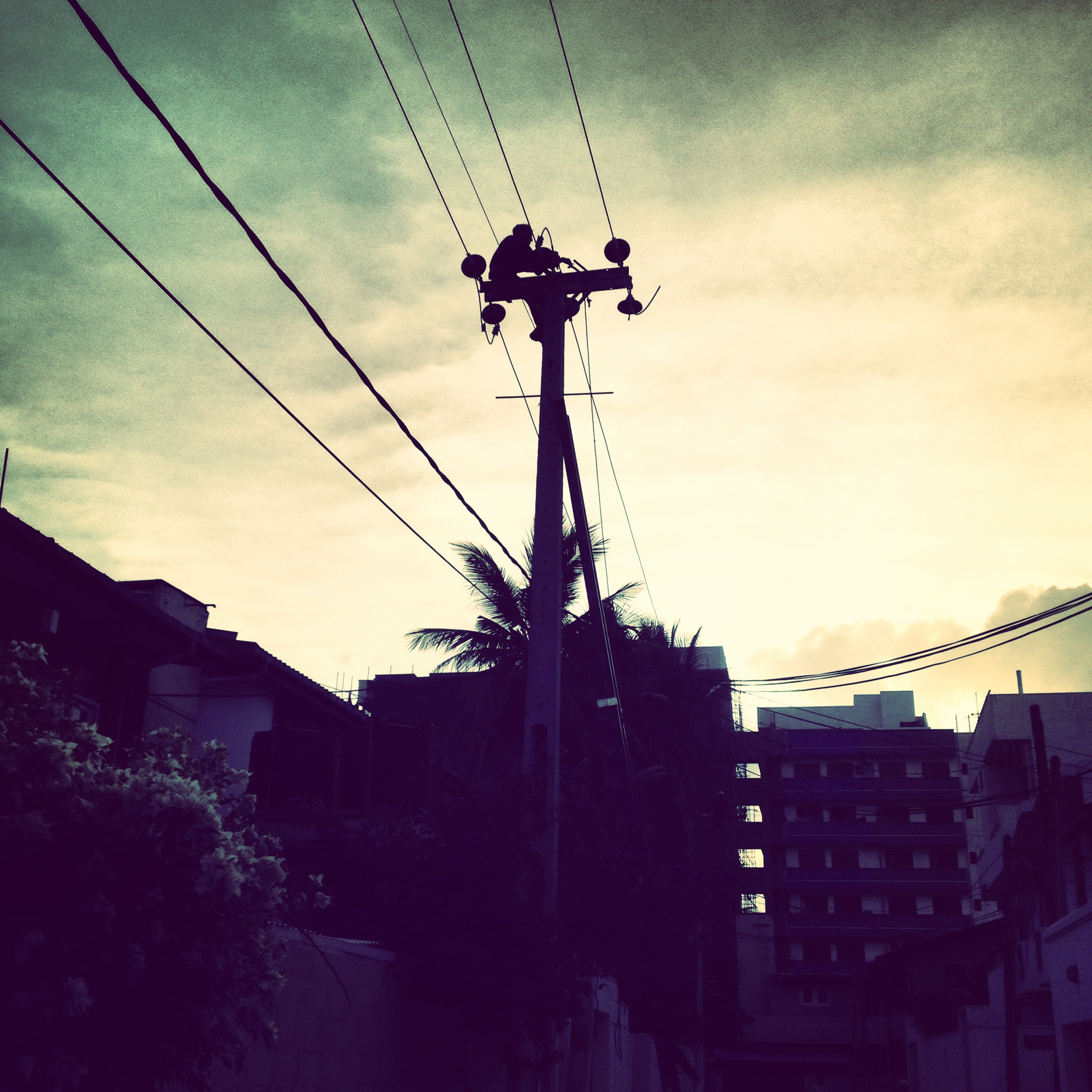 Yesterday afternoon our street was overtaken by a swarm of Lego men. Dressed in matching blue overalls and yellow hard hats, these Lego men perched themselves on every power pole in the street. With only an old piece of rope for a harness they smoked, waved, played with their phones whilst straddling their makeshift crows nests. The Lego army flung steel cables up and down the power poles sometimes catching them, most often not. Apparently they were fixing the power lines but I think they were auditioning for the new Cirque du Soleil – Electric Lego.