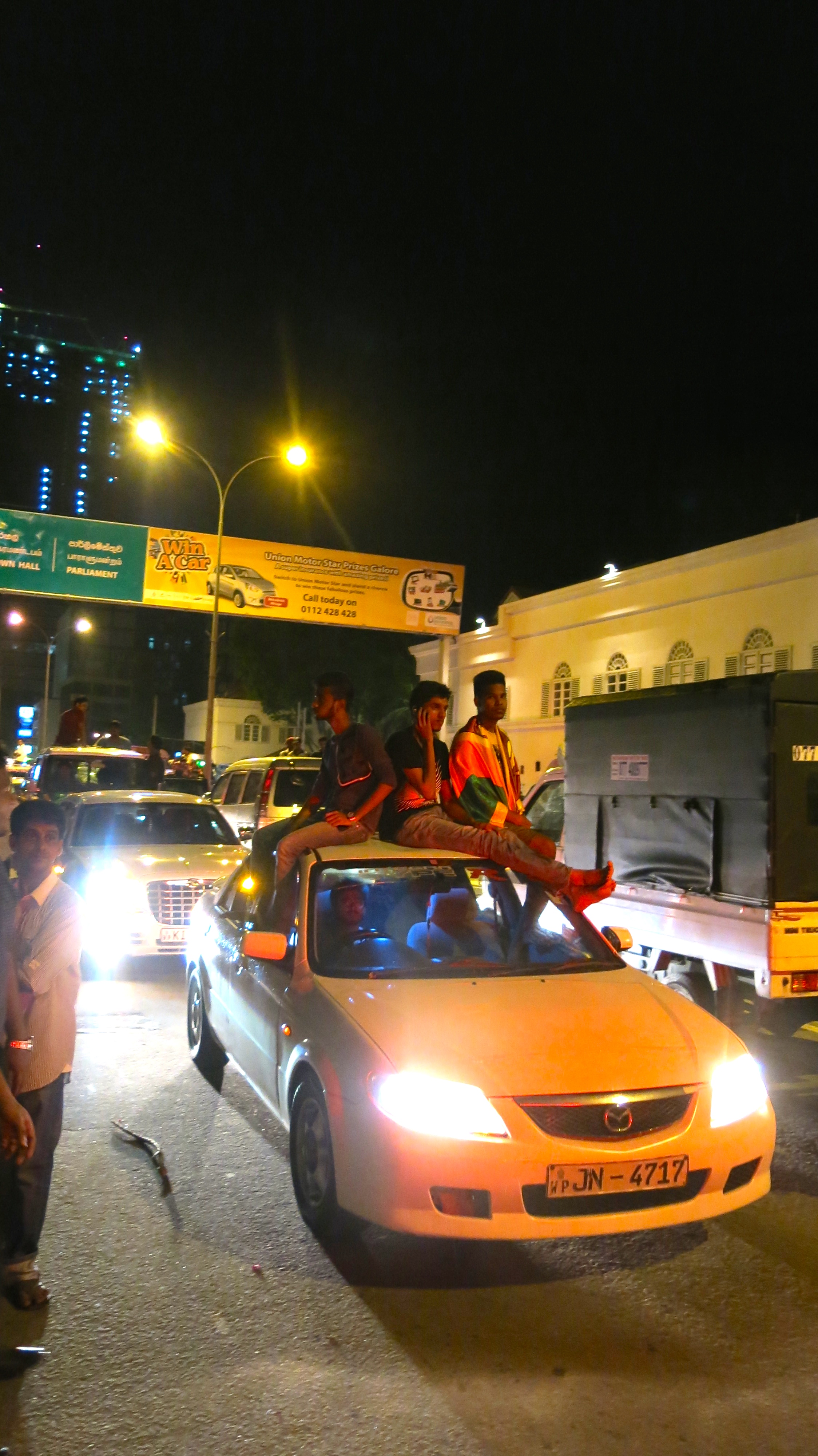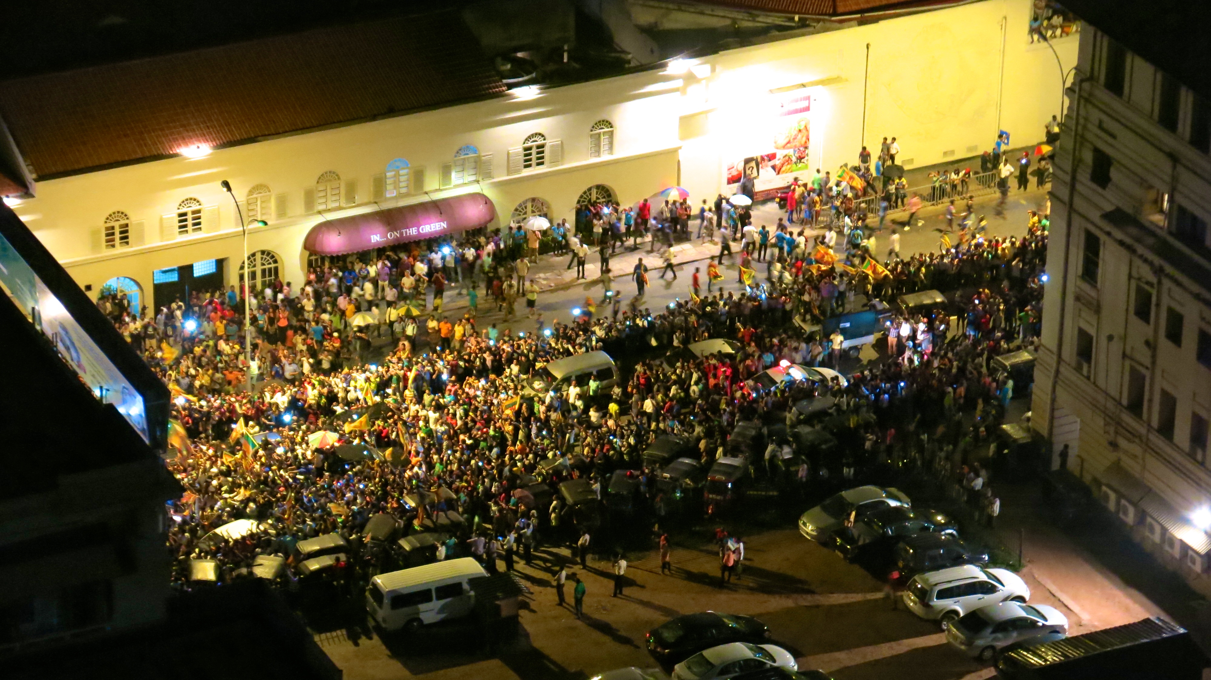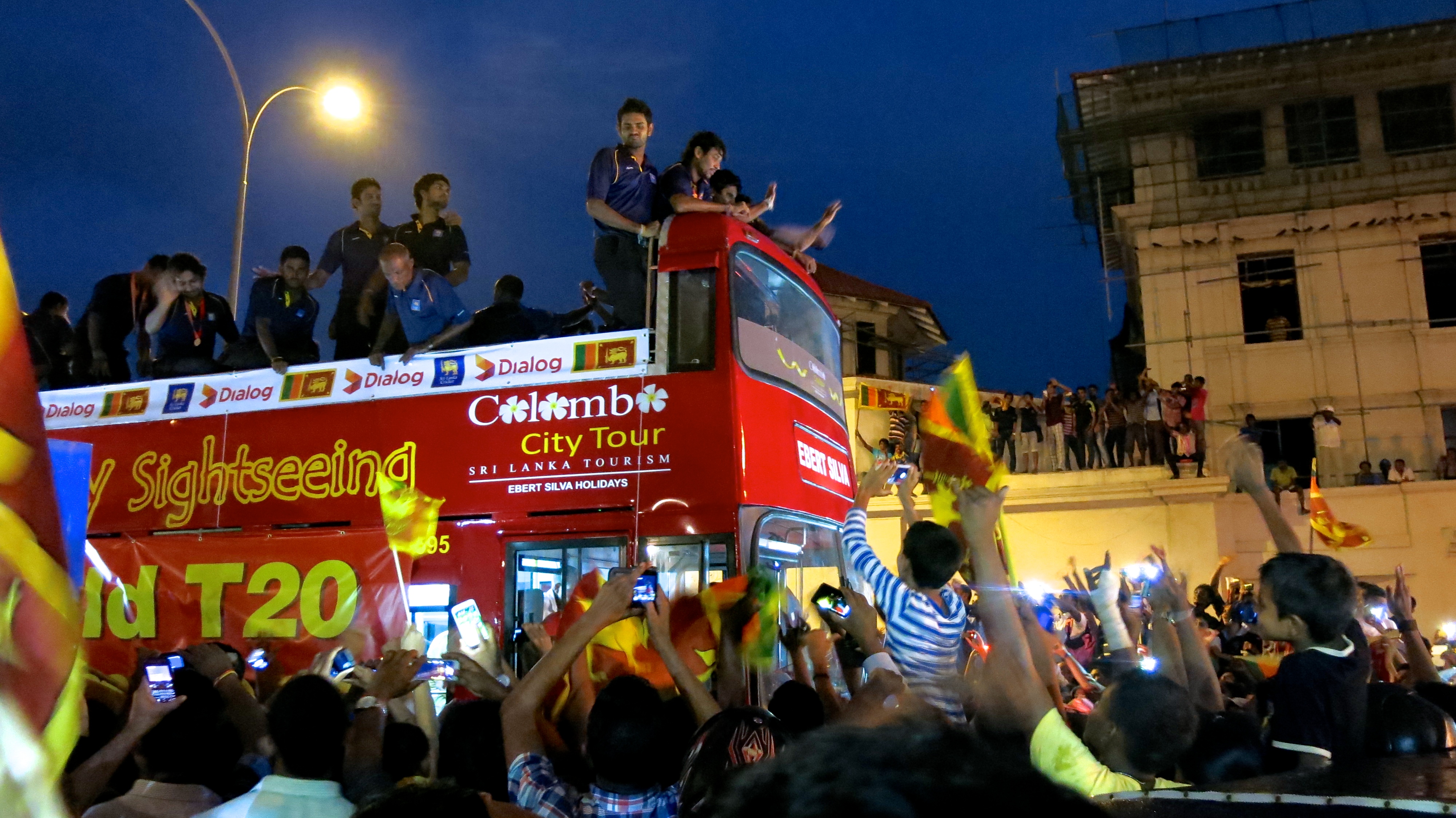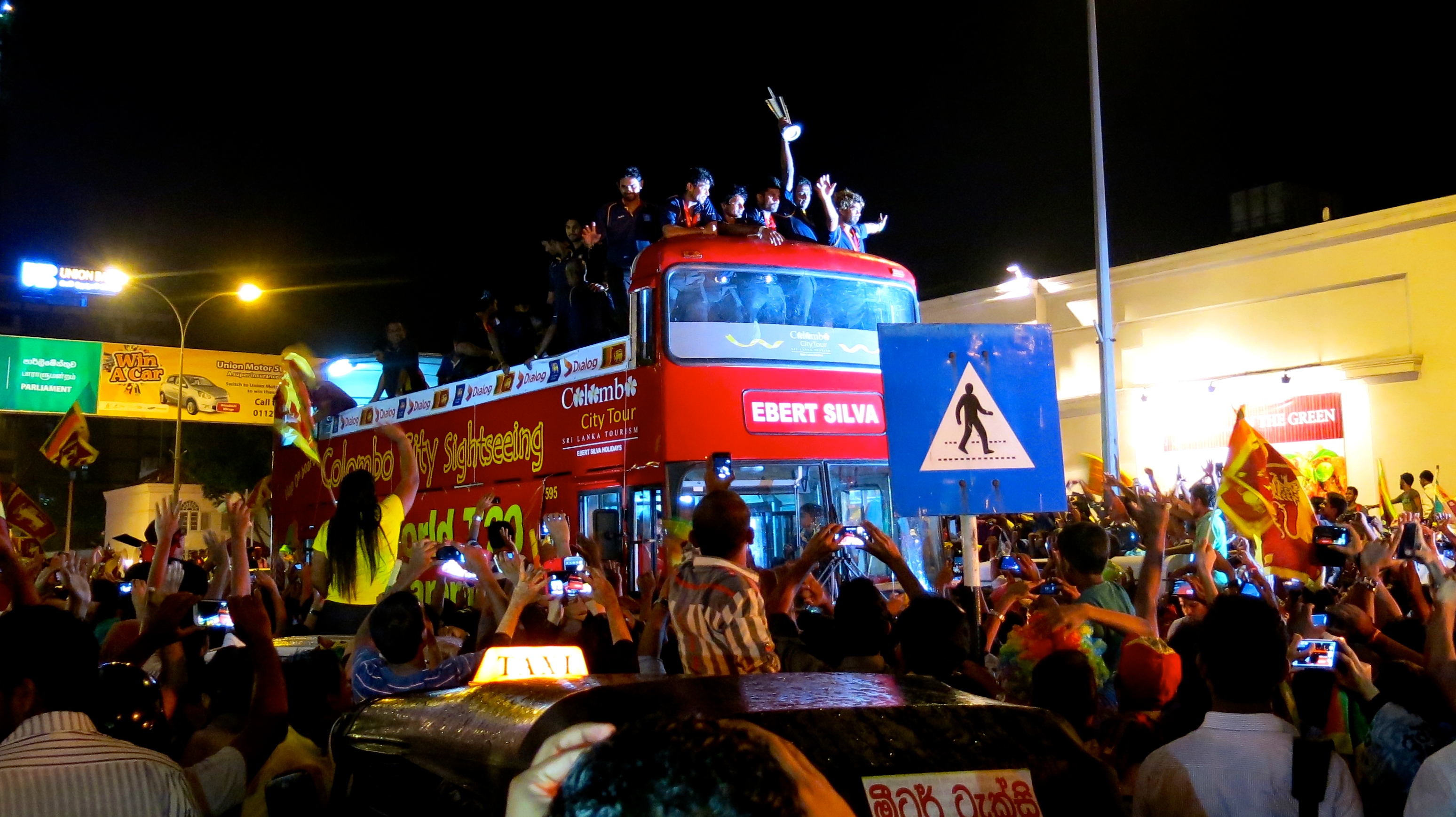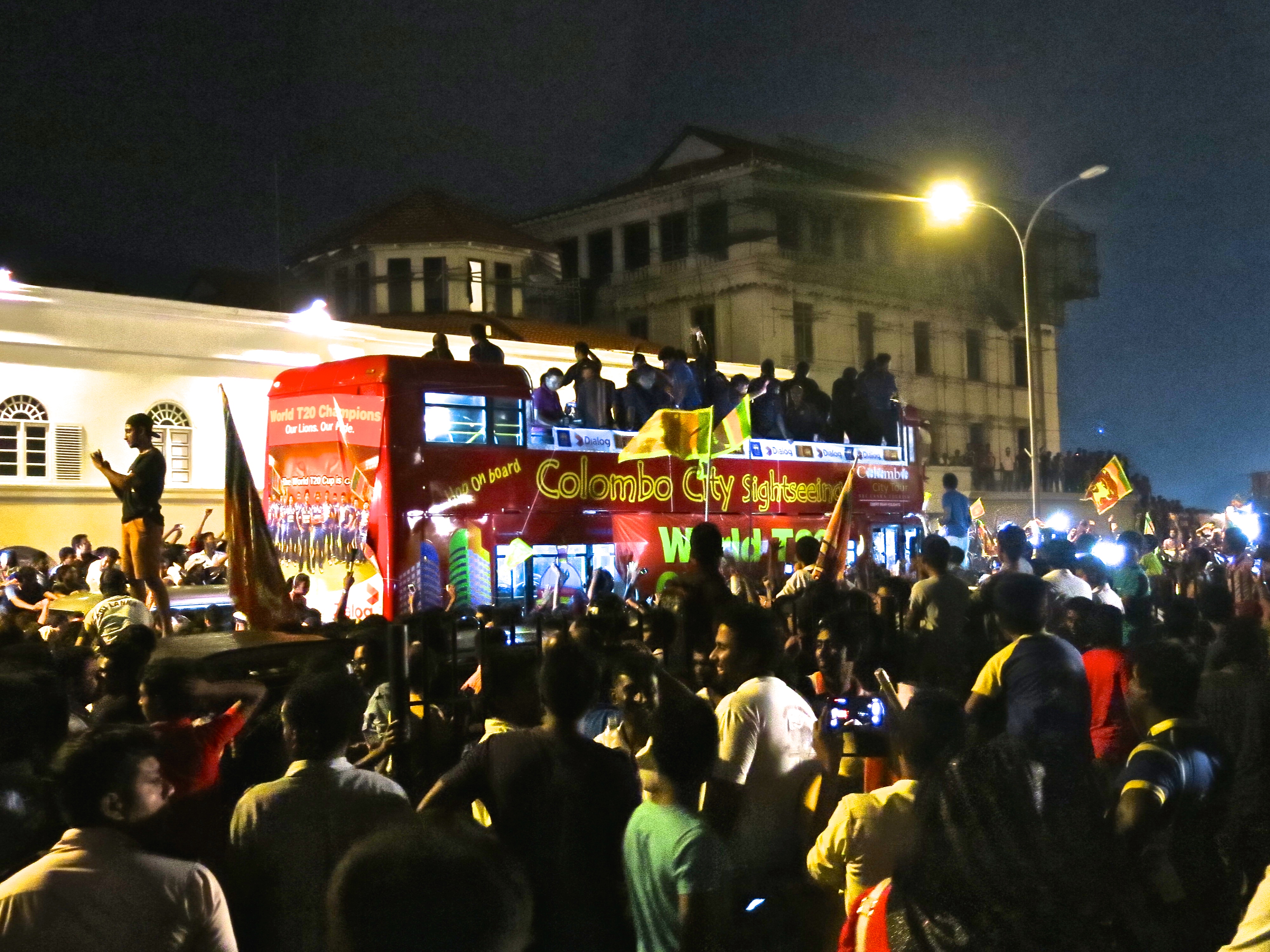 The victorious team’s flight from Bangladesh arrived back in Colombo at 4:30pm and the 30km journey from the airport in the special open top bus took 6 hours to complete. The whole country descended on Colombo to catch a glimpse of these modern day centurions as they marched on the capital to celebrate their glory on battlefields afar. Roads were blocked, cars were used as stands, work was forgotten, and people generally lost their minds.